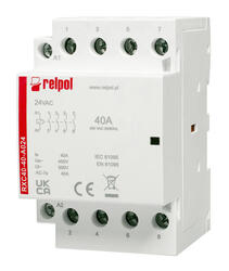 Stycznik instalacyjny 4-biegunowy 4N/O 40A 250VAC; Cewka: 24VAC Wymiary: 85 x 54 x 67 mm. Montaż na szynie 35 mm. IP 20.