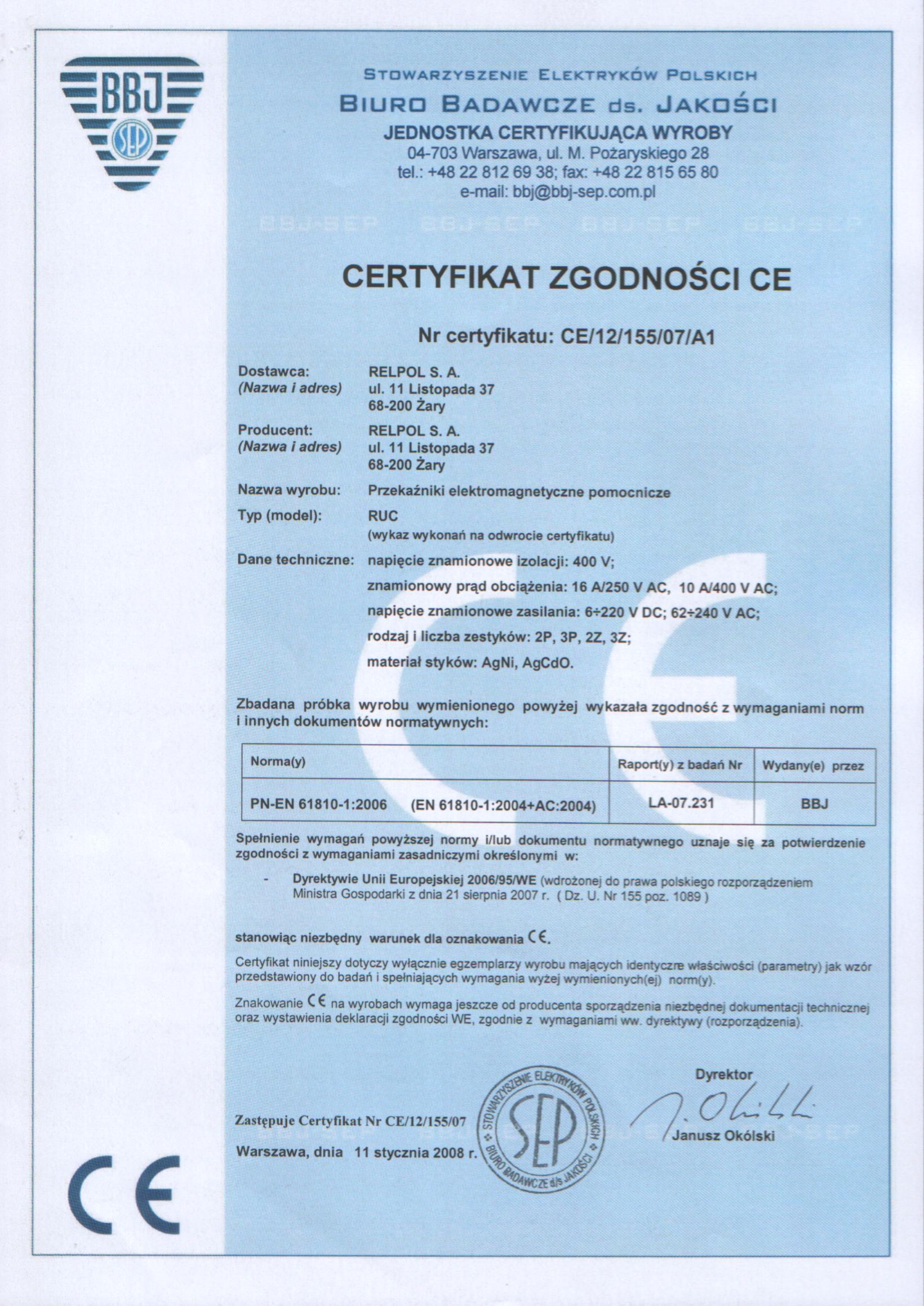 Certificate of Conformity CE RUC